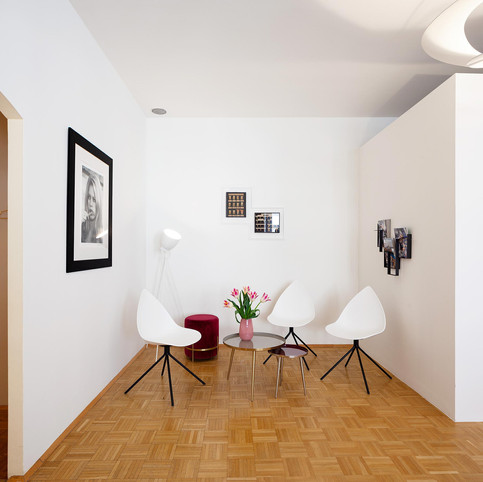 Der wartende Patient soll sich in dem Raum wohl fühlen und in bequemen Stühlen die Möglichkeit einer kurzen Entspannungsphase haben. Auch ein heller Raum wirkt sich positiv auf das Wohlbefinden aus. Zur Steigerung der Helligkeit im Wartezimmer wurden die großen Altbaufenster von den Vorhängen befreit und die Wände bis auf ein paar wenige Bilder weiß belassen.